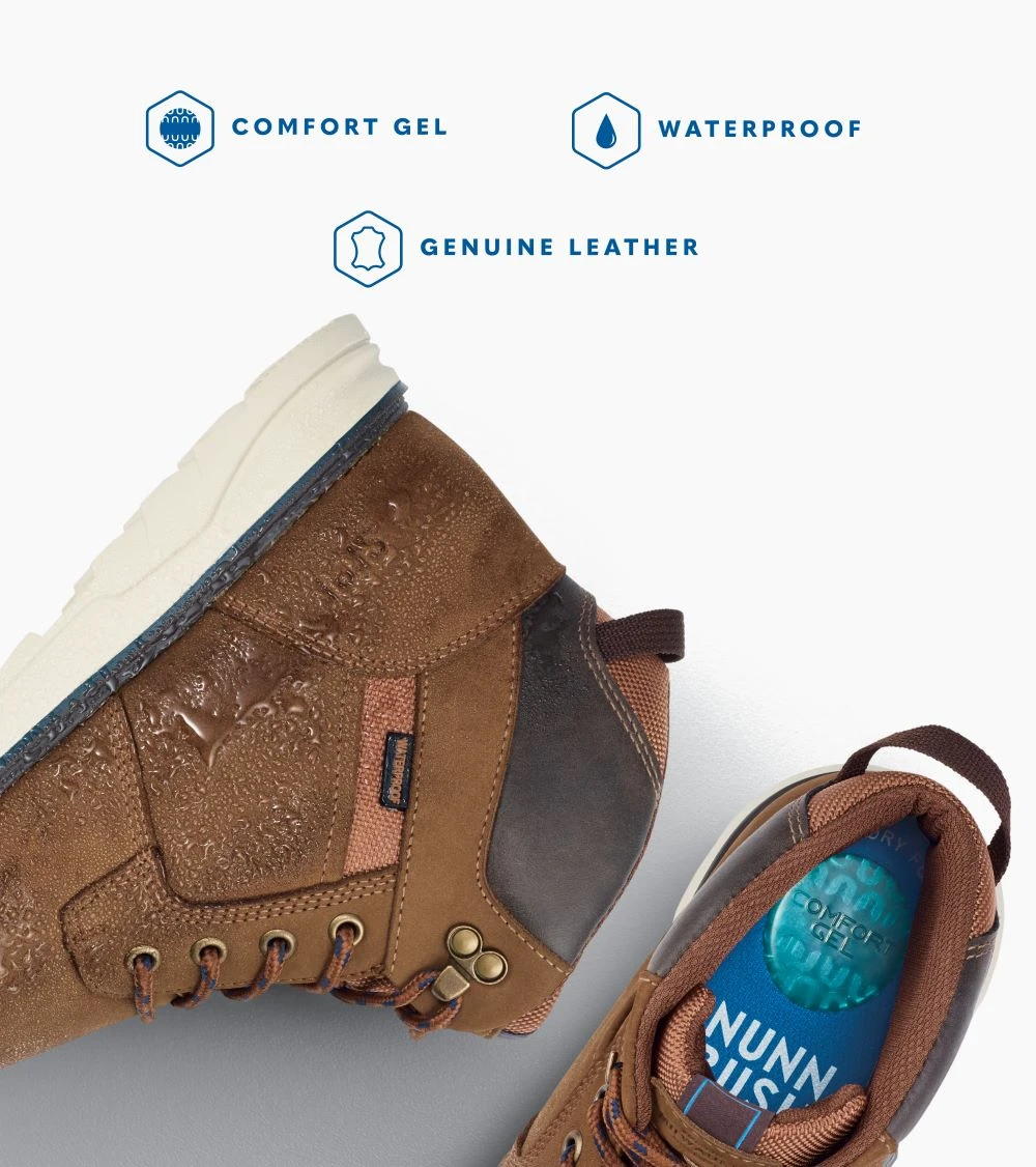 Never let the weather interfere with your plans. Be prepared with the proper practical yet stylish shoe/boot. The Luxor features a subtle two-tone midsole and seam-sealed waterproof leather upper along with a Comfort Gel footbed and Softgel heel pod.ย