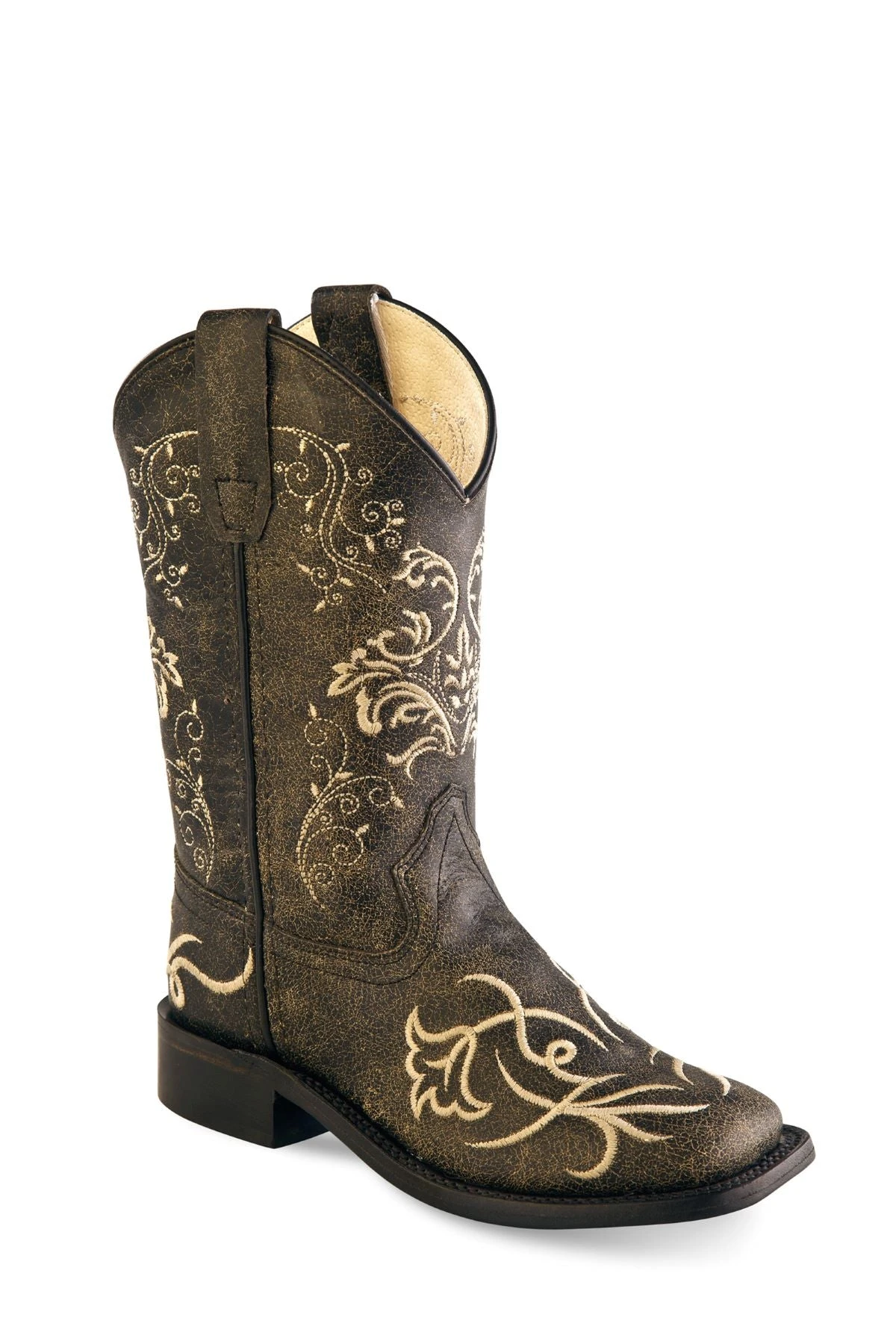 This dressy little square toe boot will look great on the wedding dance floor while she twirls the night away, or why not wear them every day. These boots feature fancy stitching, easy pull tabs and square toe comfort.